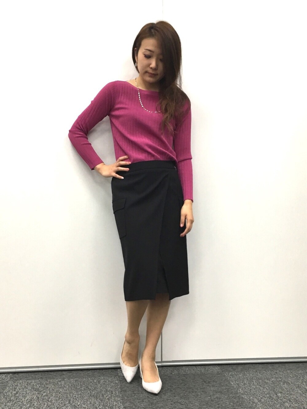 春らしくビビットなピンクのニットでお仕事カジュアル
