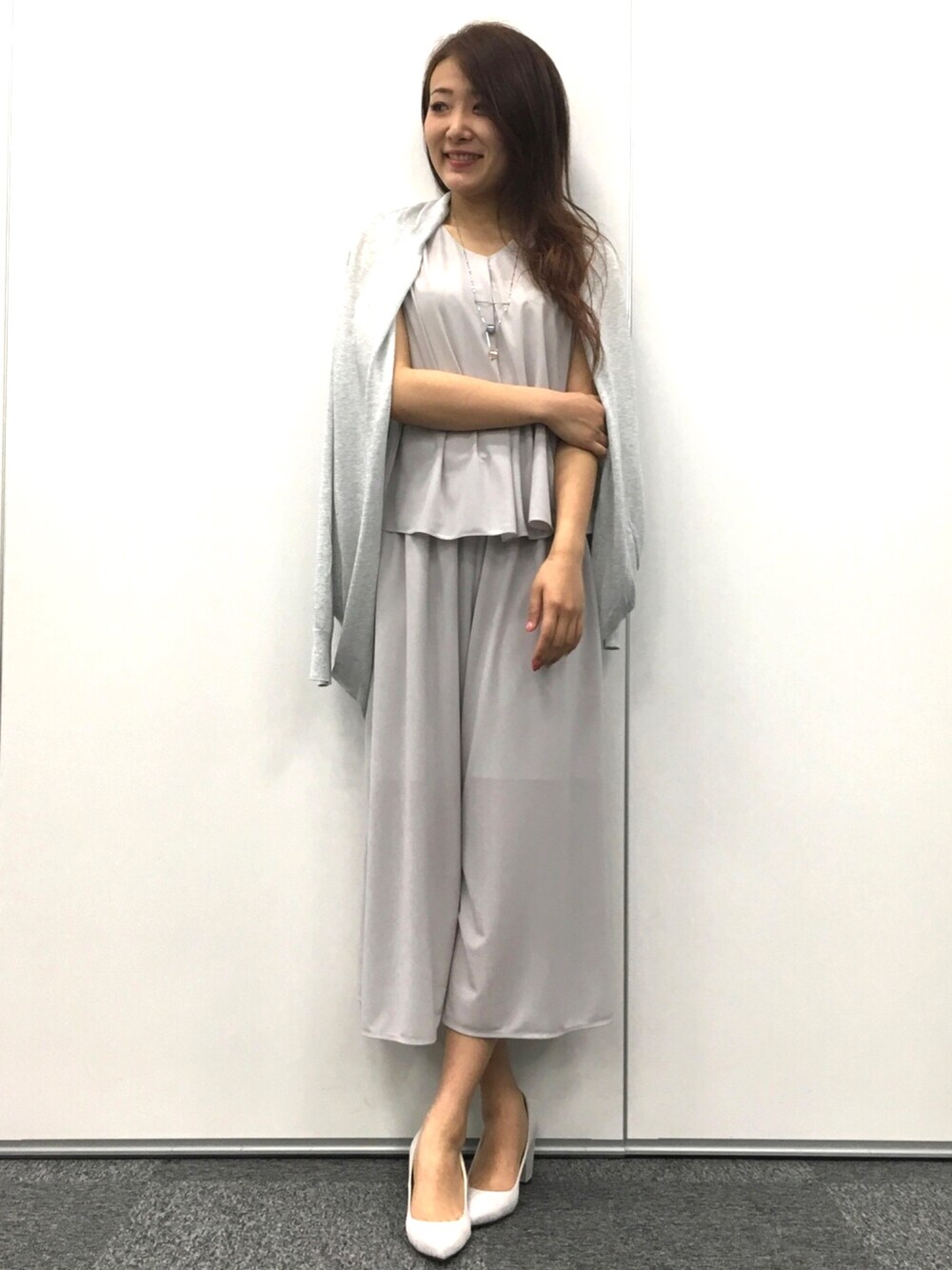 リラックスしたセットアップにドレープカーデをワントーンコーデで大人っぽく。