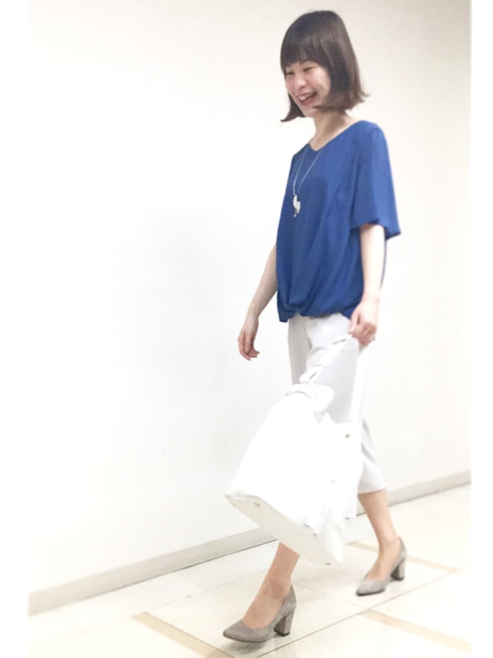 鮮やかなブルーが目をひく爽やかお出かけコーデ。インナーがカットソーだから着心地もgood!
