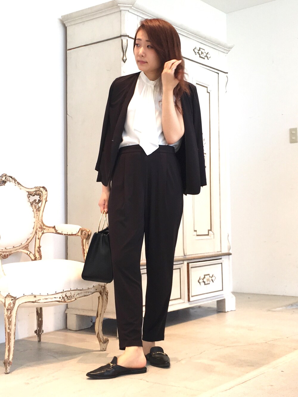 カラーレスのジャージージャケットをセットアップでお仕事コーデ。