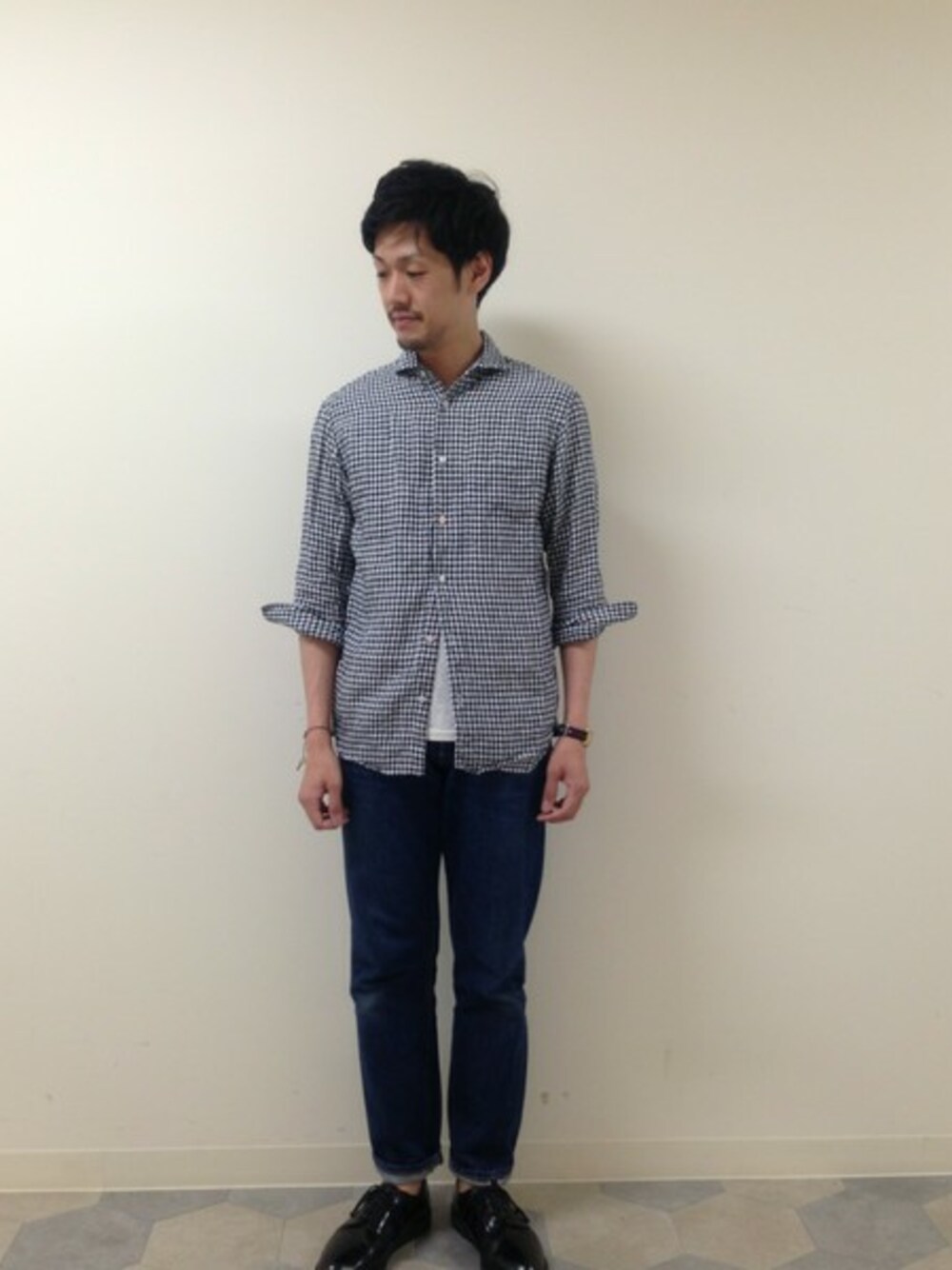 シャツ&デニムのシンプルなスタイリングですが、フレンチリネンのシャツを使い上品さを意識して、コーディネートしました。