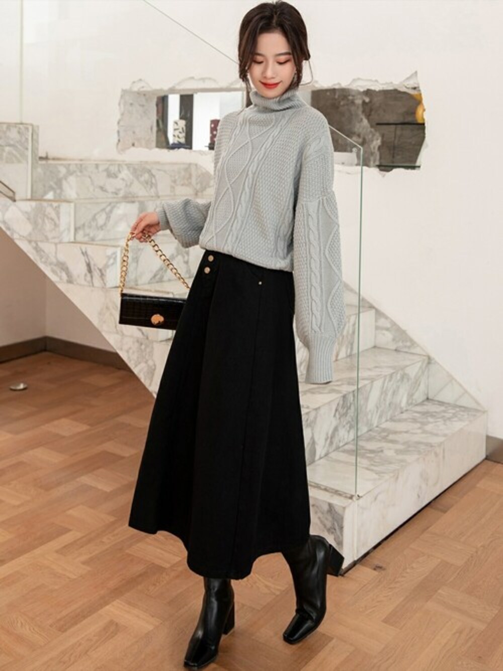 TeddyShop(TeddyShop)のニット/セーター「レディース ローゲージ風ぽわん袖タートルネックニットセーター」を使ったコーディネート