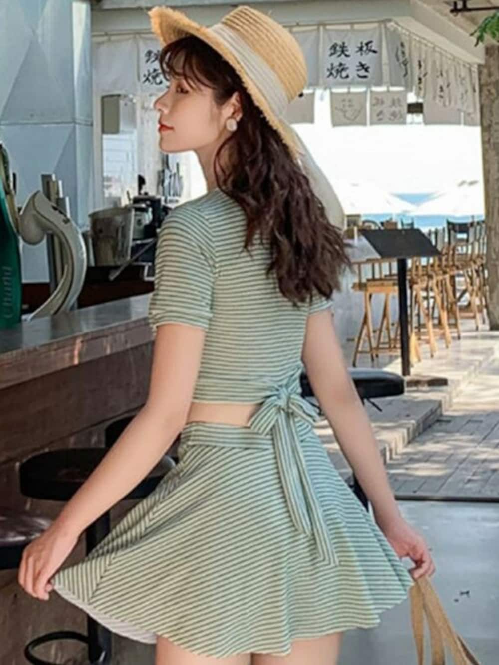 ✰⋆。:゚・*☽:゚・⋆。✰⋆。:゚・*☽:゚・⋆。✰⋆。:゚・*☽ \選べる2colors♡/ バックリボンで後ろ姿まで360度隙なく映える♡ ボーダー柄バックリボンビキニが新登場♡ レトロ可愛いボーダー柄の半袖ビキニは 露出が少なめなので使いやすさ抜群♪ フレアスカートで太もも周りもフワッと カバーできてお洋服のように着こなせるので ビーチサイドの散策などでも写真映え抜群♪ コーデは旬の色合いで魅せるグリーン♡ サイズもS~LLまで幅広く展開中です♡ ✰⋆。:゚・*☽:゚・⋆。✰⋆。:゚・*☽:゚・⋆。✰⋆。:゚・*☽