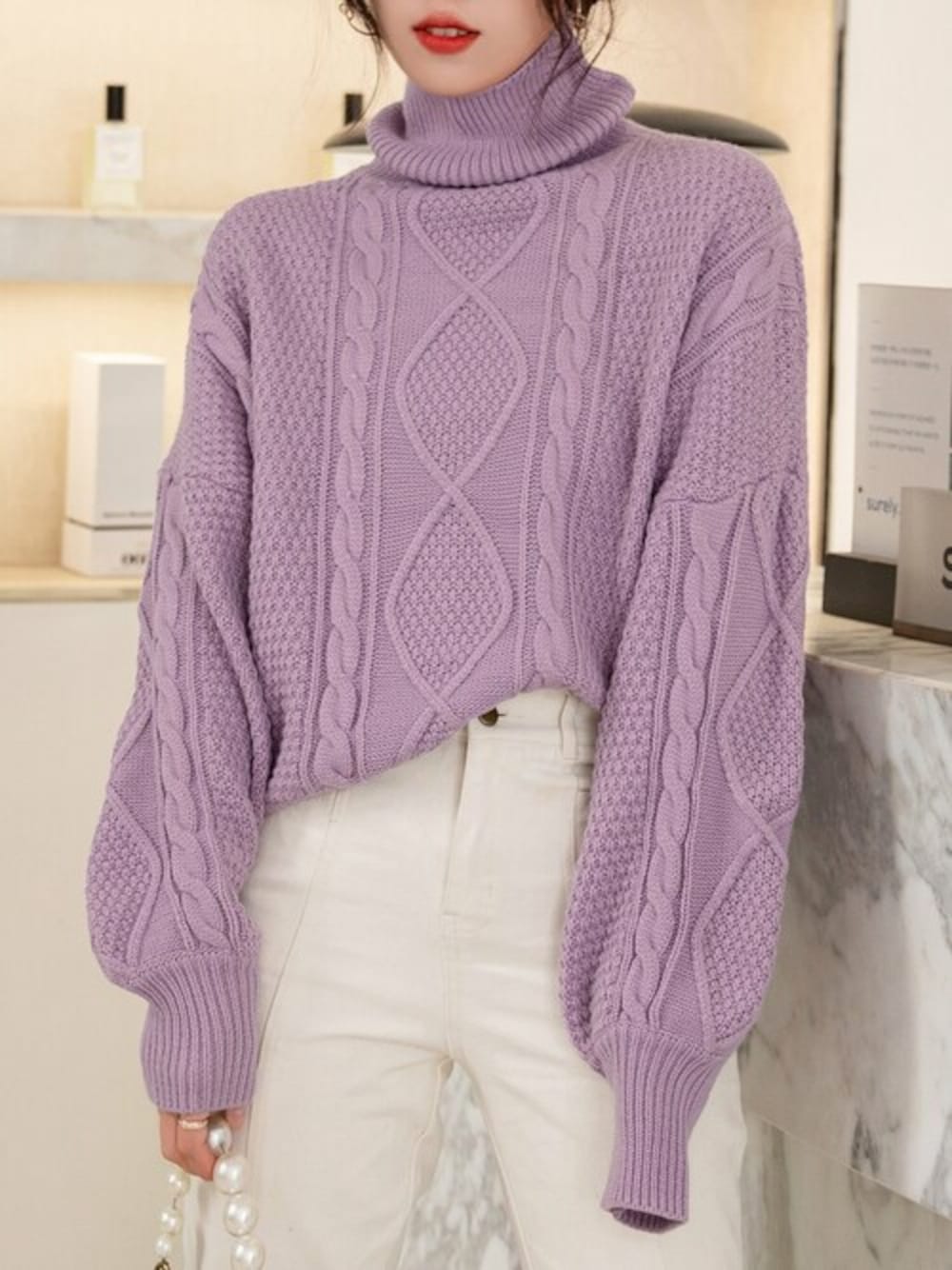 ✰⋆。:゚・*☽:゚・⋆。✰⋆。:゚・*☽:゚・⋆。✰⋆。:゚・*☽ \選べる5colors♡/ ぽわんとした袖がフェミ可愛い♡ タートルネックニットセーターが登場中♡ コーデは大人っぽくも優しい雰囲気を醸すパープル。 立体感のあるローゲージのこだわりミックス編みが 特徴的なニットセーターはぽわん袖でゆるい シルエットをメイク。 すとんと落ち感のあるドロップショルダーなので 肩幅も目立たずゆとりある着こなしが完成します♡ 見た目可愛いのはもちろんのことタートルネックで 首元までしっかり暖かく、リブ袖で冷気を しっかりシャットダウンできるのもポイント♡ ✰⋆。:゚・*☽:゚・⋆。✰⋆。:゚・*☽:゚・⋆。✰⋆。:゚・*☽