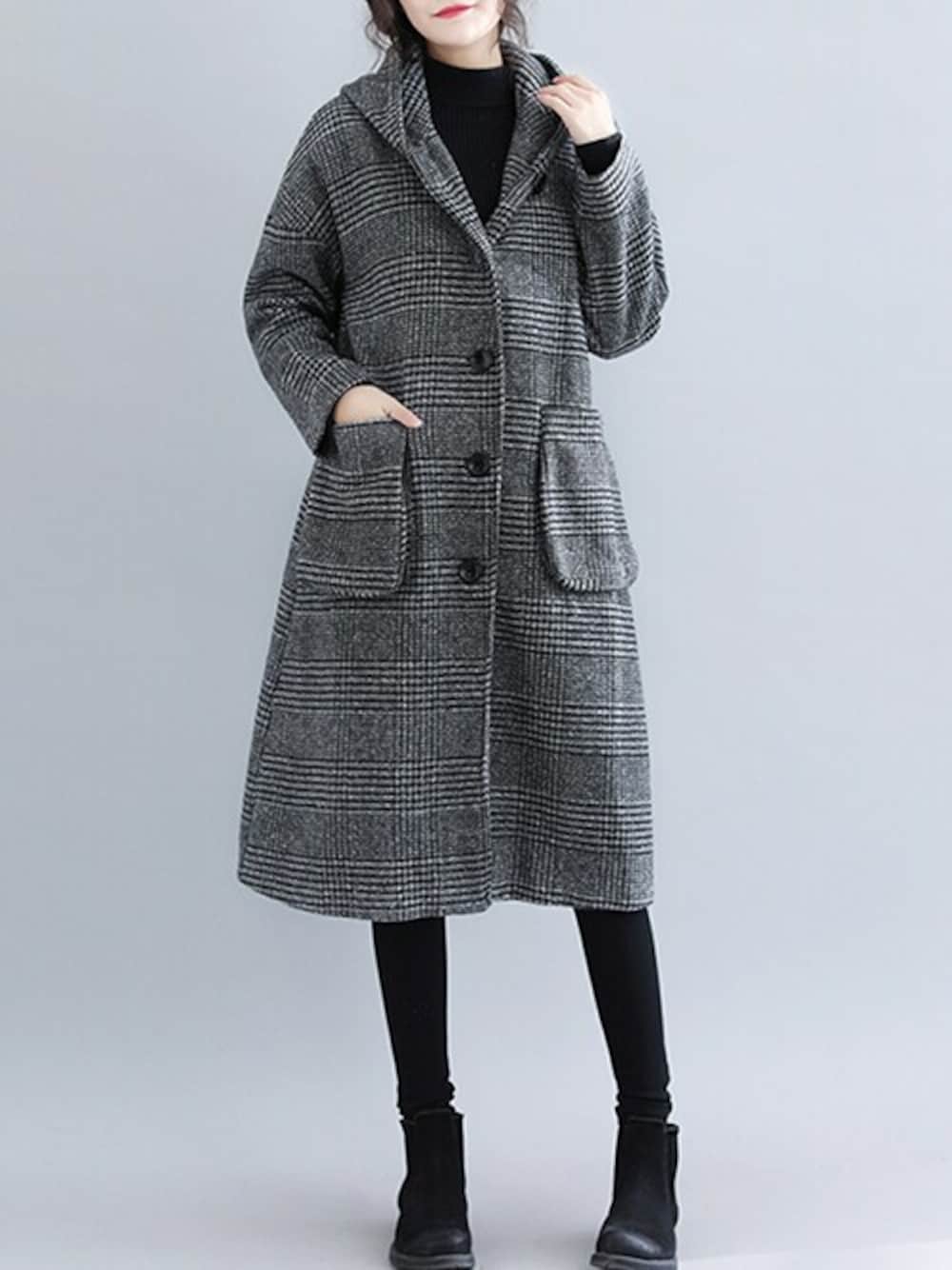 TeddyShop(TeddyShop)のノーカラーコート「【ドラマ衣装提供】ロング チェスターコートレディース フード付きグレンチェックノーカラーコート 秋冬」を使ったコーディネート