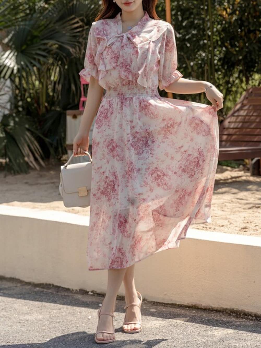 TeddyShop(TeddyShop)のワンピース「レディース 小花柄ボウタイシフォンAラインリゾートワンピース」を使ったコーディネート