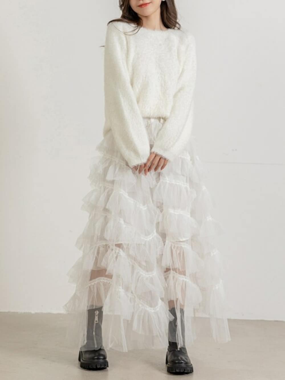 TeddyShop(TeddyShop)のスカート「【ロング丈/幅広ゴム/裏地付き】ふわっと風に舞う。大人っぽ ティアード フリル チュール スカート レディース」を使ったコーディネート