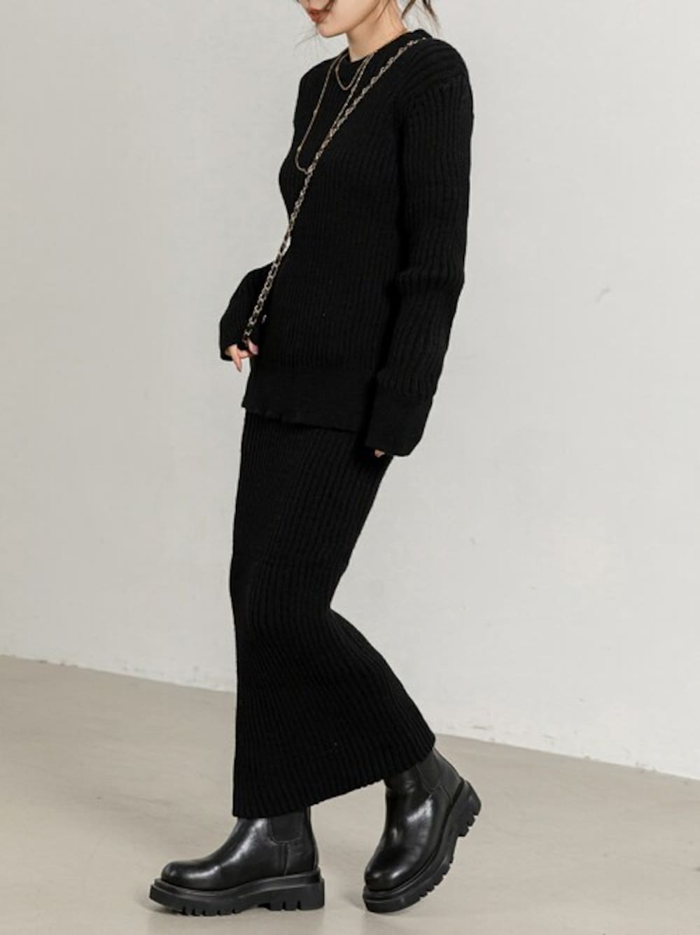 TeddyShop(TeddyShop)のセットアップ「【セットアップ】 秋冬すっきりシルエット。長袖リブニットセータートップス+スカート 上下2点セット レディース」を使ったコーディネート