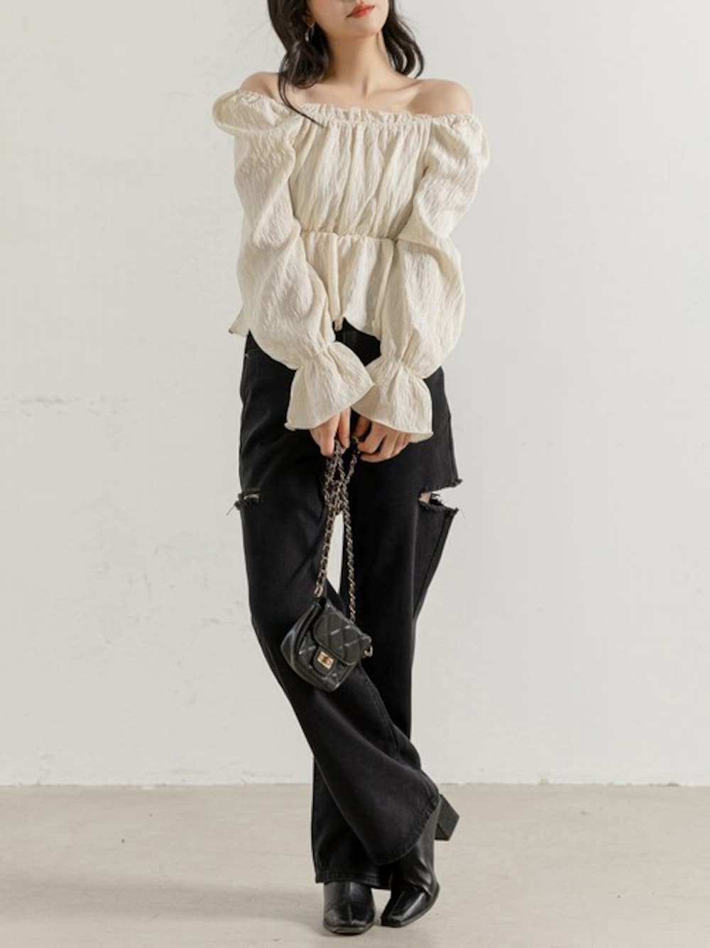 TeddyShop(TeddyShop)のシャツ/ブラウス「レディース 長袖2WAYシボ加工ペプラムオフショルブラウス」を使ったコーディネート