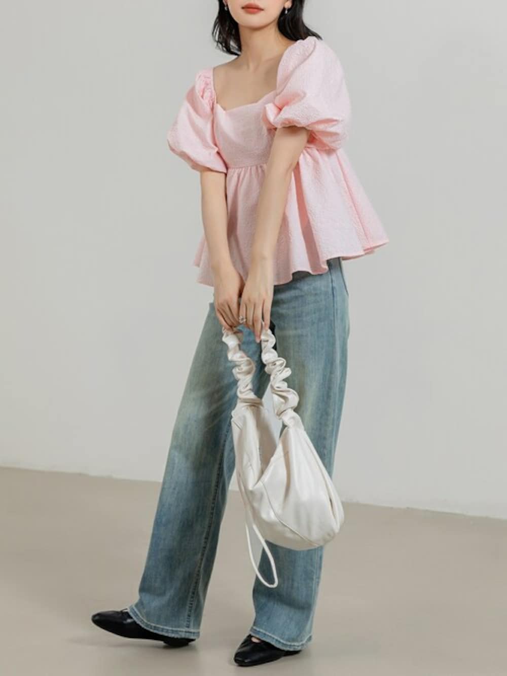 TeddyShop(TeddyShop)のシャツ/ブラウス「レディース 2WAYオフショル&スクエアネックのランタンスリーブペプラムブラウス」を使ったコーディネート