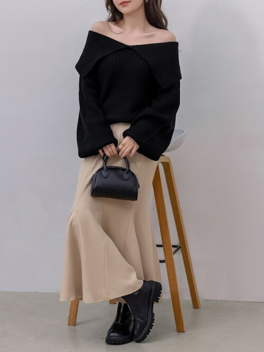 TeddyShop(TeddyShop)のニット/セーター「【2WAY/オフショルダーでデコルテ綺麗見せ】大人っぽ長袖ボリューミーリブニットトップス」を使ったコーディネート