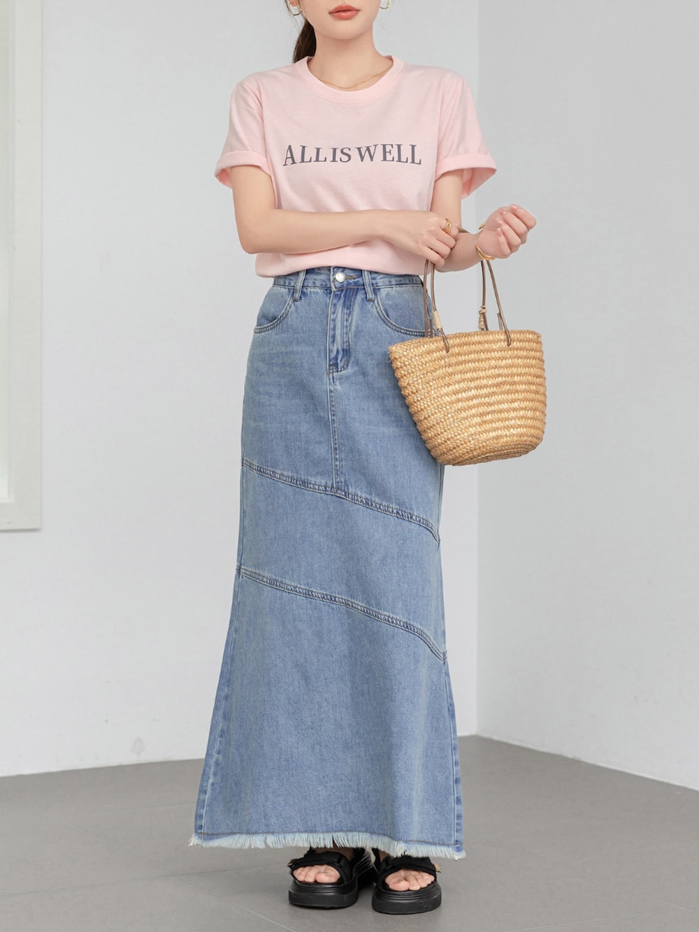 TeddyShop(TeddyShop)のデニムスカート「【大きいサイズ有】程よいくびれライン。斜め切り替え×フリンジデニムマーメイドスカート レディース」を使ったコーディネート
