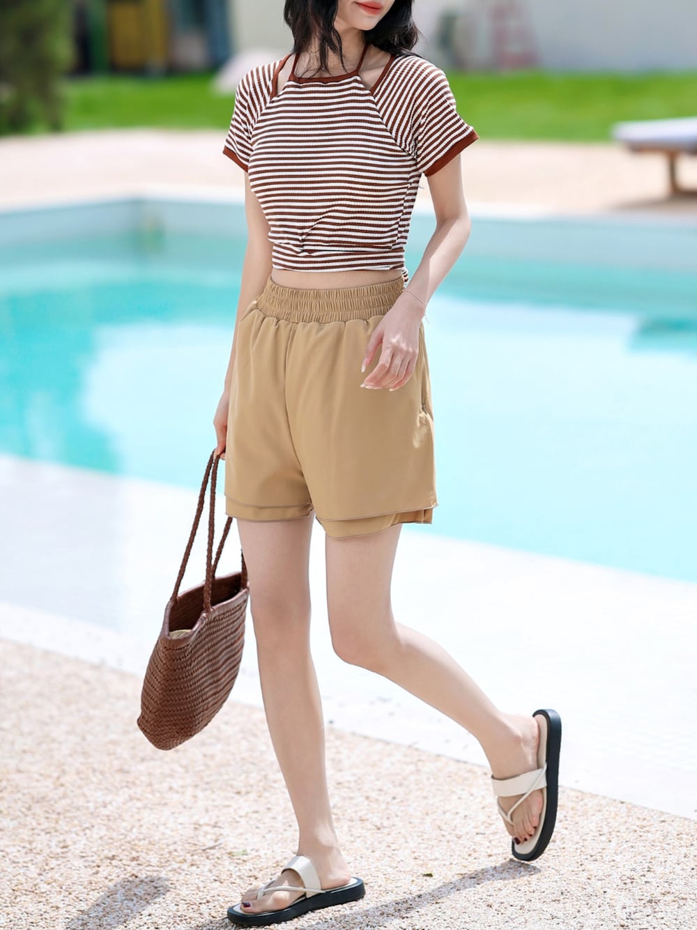 TeddyShop(TeddyShop)の水着「レディース水着 半袖ボーダー柄ホルターネックバックリボンクロップドビキニ 上下2点セット【WEB限定】」を使ったコーディネート