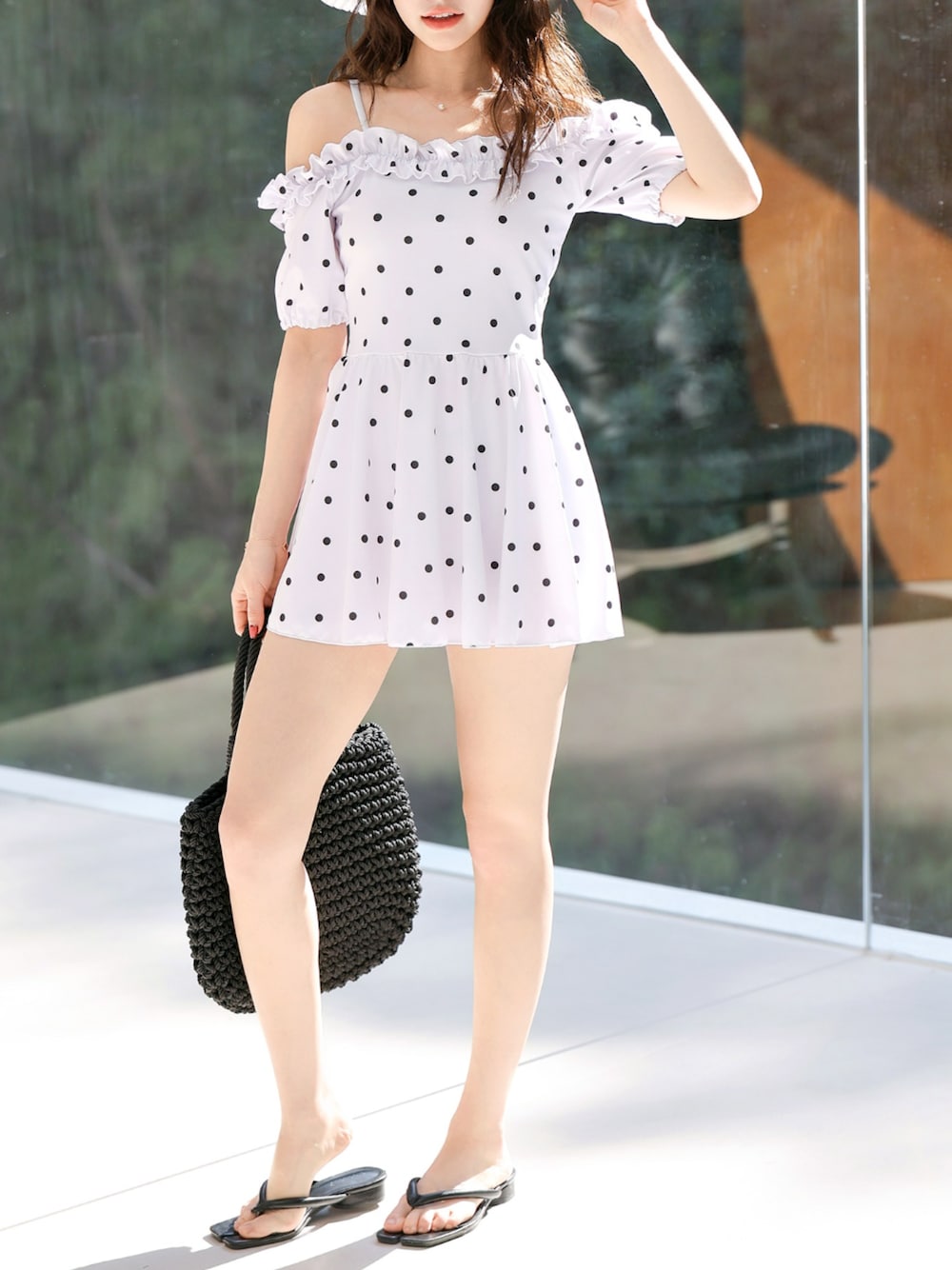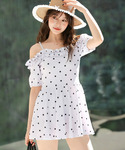 TeddyShop(TeddyShop)の水着「レディース水着 ギャザーフリルオフショルフレアワンピース+ハイウエストショーツ 上下2点セット」を使ったコーディネート