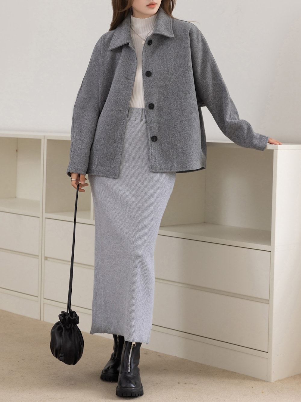 TeddyShop(TeddyShop)のその他アウター「【裏キルティング/前後アシメで後ろ姿カバーアップ】長袖チェック襟ドルマンスリーブショートコート レディース」を使ったコーディネート