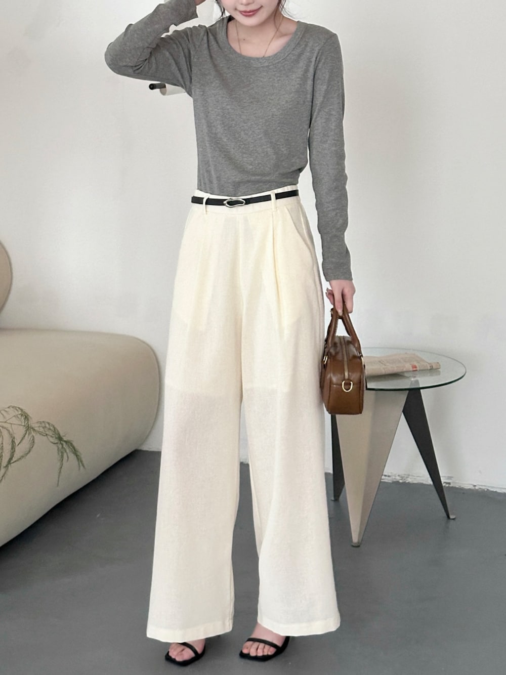 TeddyShop(TeddyShop)のその他パンツ「【縦ライン強調/ストンと落ち感シルエット】フロントタック リネン ワイドパンツ レディース」を使ったコーディネート