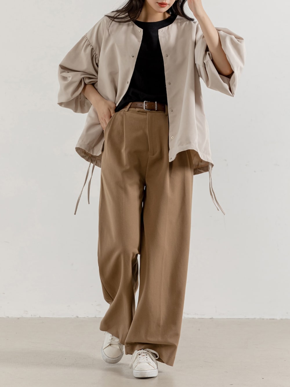 TeddyShop(TeddyShop)のブルゾン「【ミドル丈/シルエットが変わる紐付き】長袖ノーカラーバルーンスリーブブルゾン レディース」を使ったコーディネート
