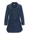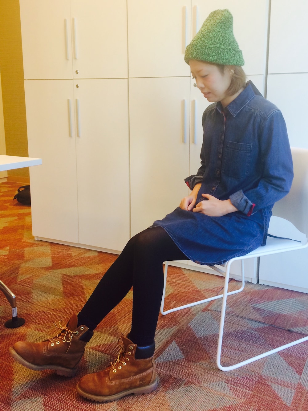 ベーシックなデザインのデニム地シャツワンピをさらっと着てみました! シンプルになりすぎないように、定番のシックスインチブーツと緑のニット帽をプラス!