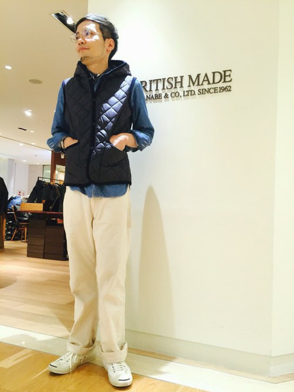 休日に着るならこんな感じ… スニーカーにゆるいパンツで気取らずに。 見えにくいですが、首元のバンダナで ちょっとだけこなれてるアピール笑 *着用してるベストはBRITISHMADE別注のメンズサイズとなります。