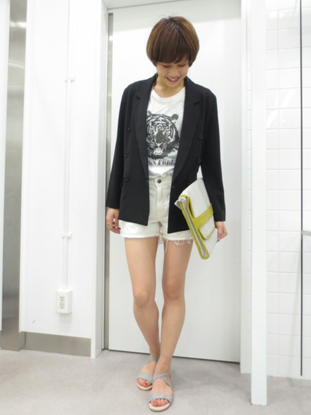 抑えめなカラーでシンプルなコーディネートですがインパクトある虎Tシャツをチョイス。 足元は春らしく素足です。