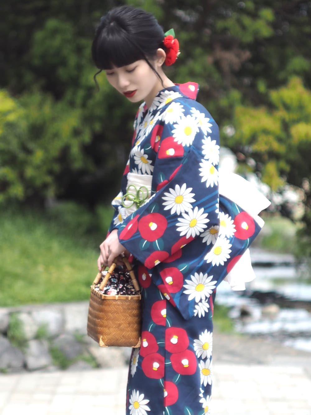 まんまる紅色椿のレトロ浴衣✳︎ 白の帯ですっきりと合わせました。