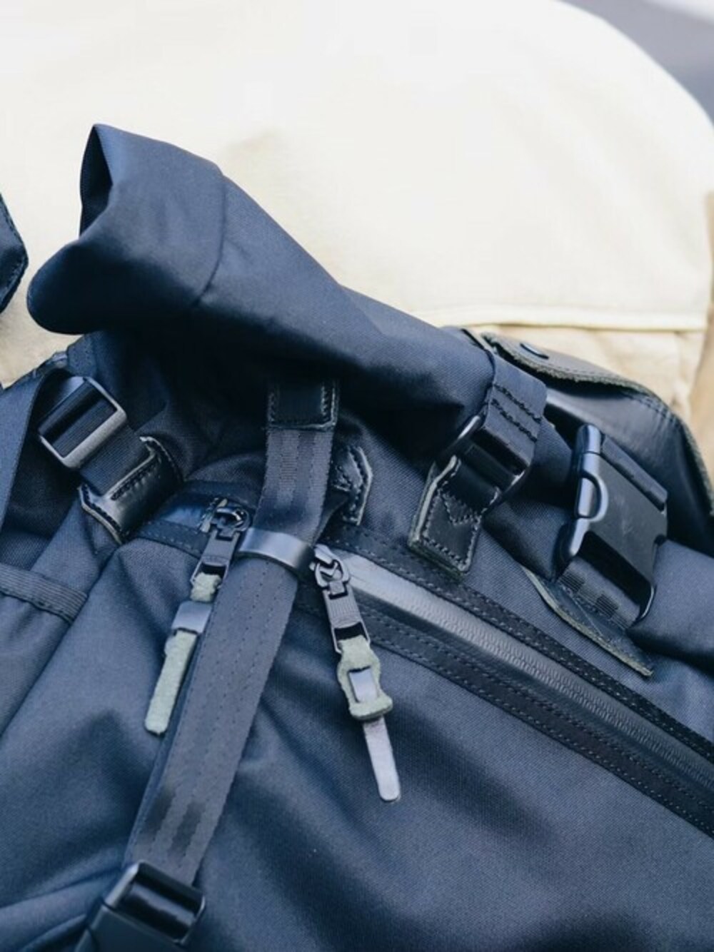 本体素材にはタテ・ヨコに305d の特殊ポリエステル糸を使用したCORDURA® 305d fabric を使用しているため、摩擦・引き裂き・すり切れ等に対する強度を 備えています。ドビー織機で織り上げていますのでオックス、ツイル織りでは 表現出来ない特徴的な生地目になっています。 また、生地の裏面に通常よりも 2 倍量のPU 加工を施すことで、生地に程よいボリューム感を出しています。内装にはPC 等の収納スペースをもうけており、起毛素材や厚みのあるクッション材を 使用していますので電子機器をしっかりと保護してくれます。 また、背面や ショルダーパッド等にもしっかりとしたクッション材を入れショルダーパッドにポケットを 付け、携帯や鍵等を素早く出し入れ出来る仕様になっております。素材を オールブラックで統一しつつもニッケルメッキで仕上げたAS2OV オリジナル 真鍮プレートがポイントになり、機能面も充実したシリーズになります。