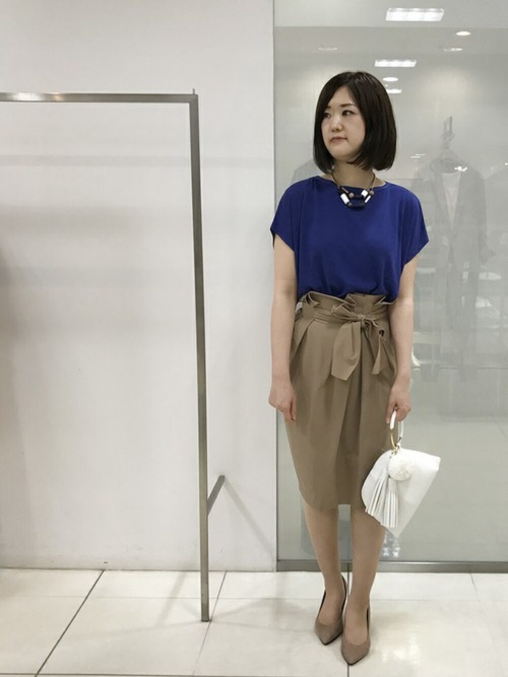 タックフリルとリボンがポイントのスカートに、鮮やかなブルーのニットを組み合わせた初夏のコーディネートです。 ニットは丈が長いのでパンツスタイルにもおすすめです。