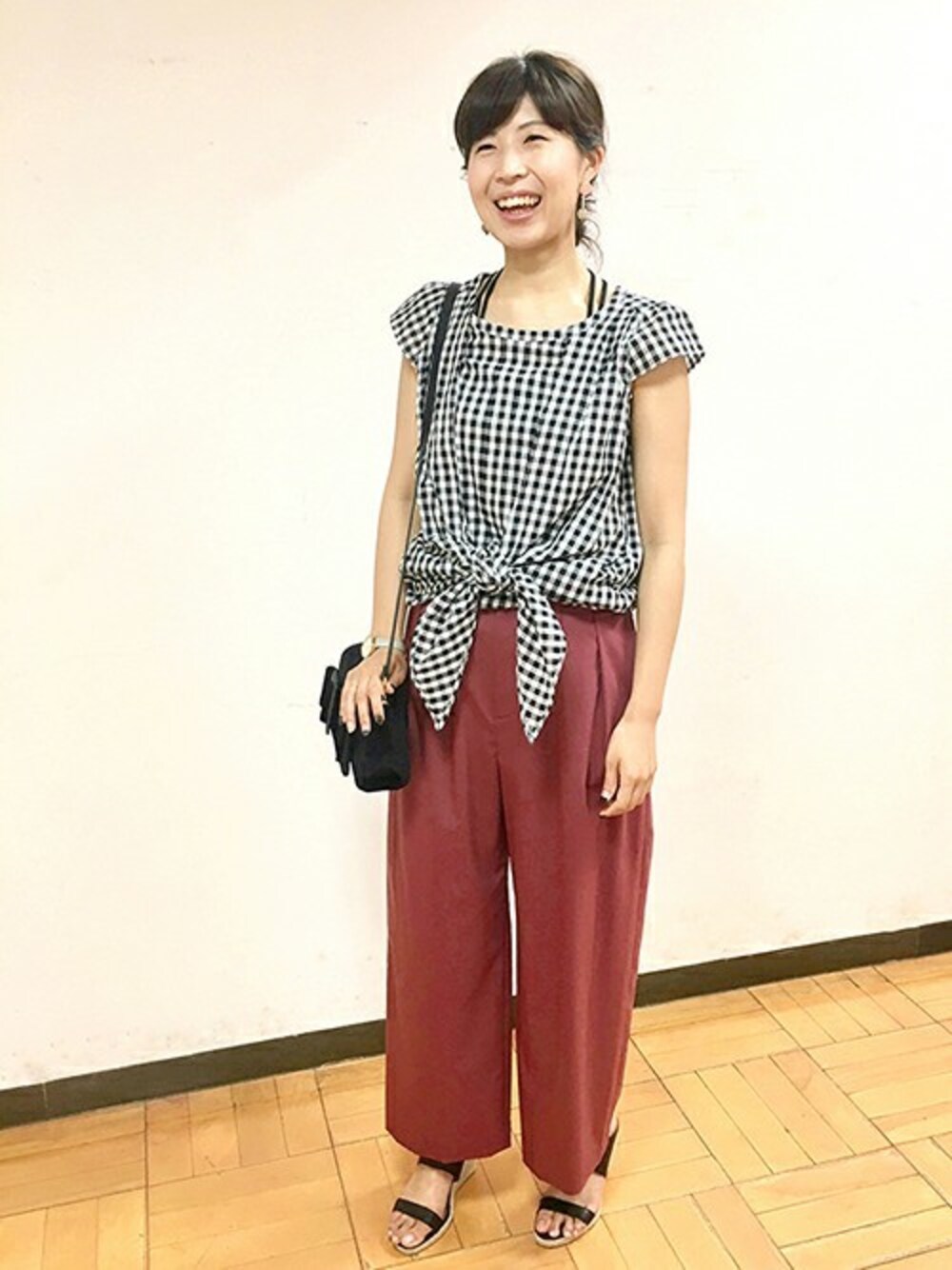 フロントのリボンがポイントのブラウスは、ウエスト位置で結ぶことでスタイルアップして見えます。 秋カラーのワイドパンツと合わせて、今から初秋まで楽しめるスタイリングです。