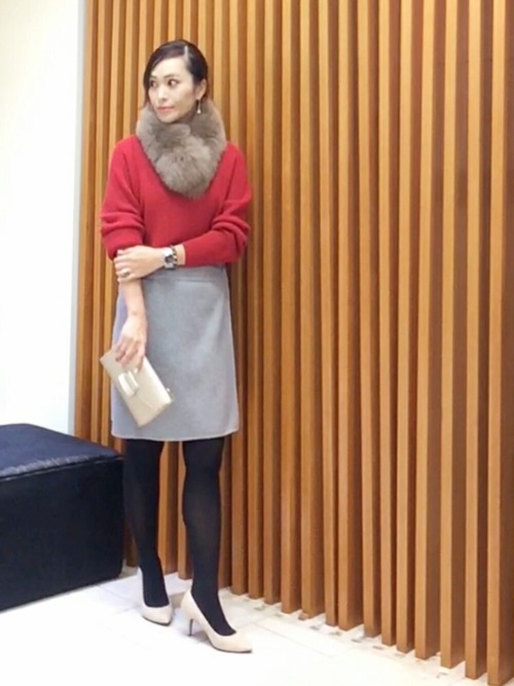 これからの季節にぴったりの赤のニットを使ったスタイリングです。 ファーやクラッチバッグなどで華やかさをプラスしました。 今年トレンド復活のミニ丈のスカートで、レディなスタイリングにしました。