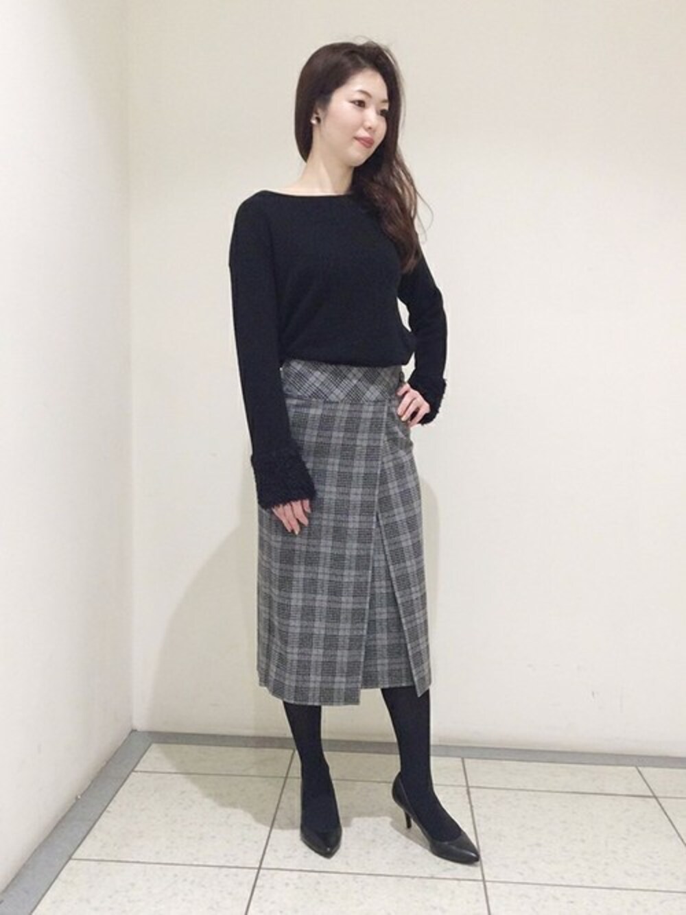 女性らしいペンシルスカートを、スッキリ見せるインスタイルでコーディネートしました。 袖にファーが付いたニットを合わせ、フェミニンな印象に仕上げています。