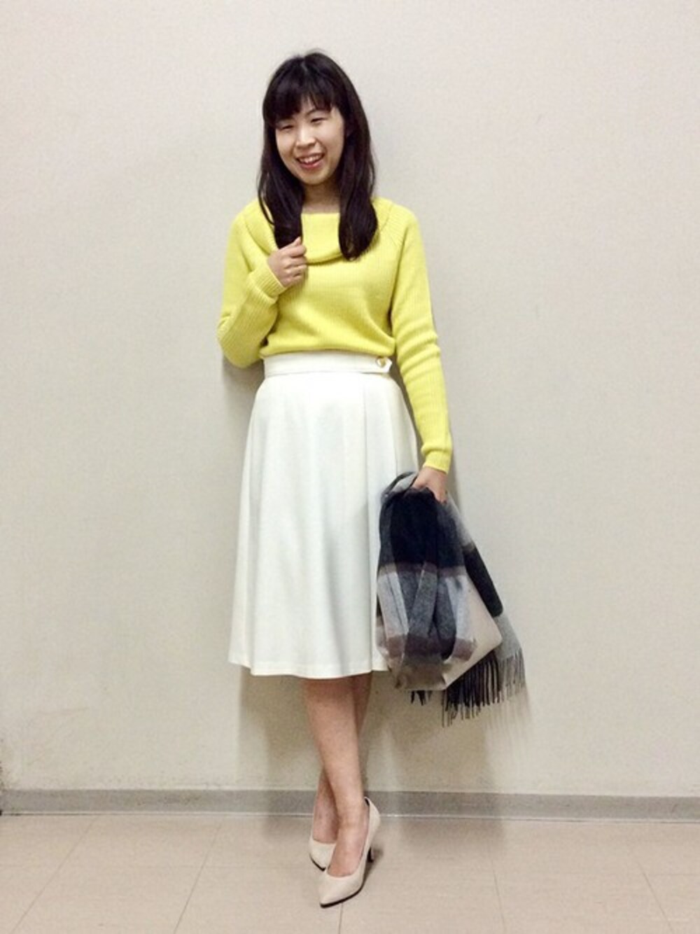 春先取りのエッグイエローのニットは、女性らしい優しげな印象。 白いスカートと合わせて、華やかなスタイルに仕上げました。