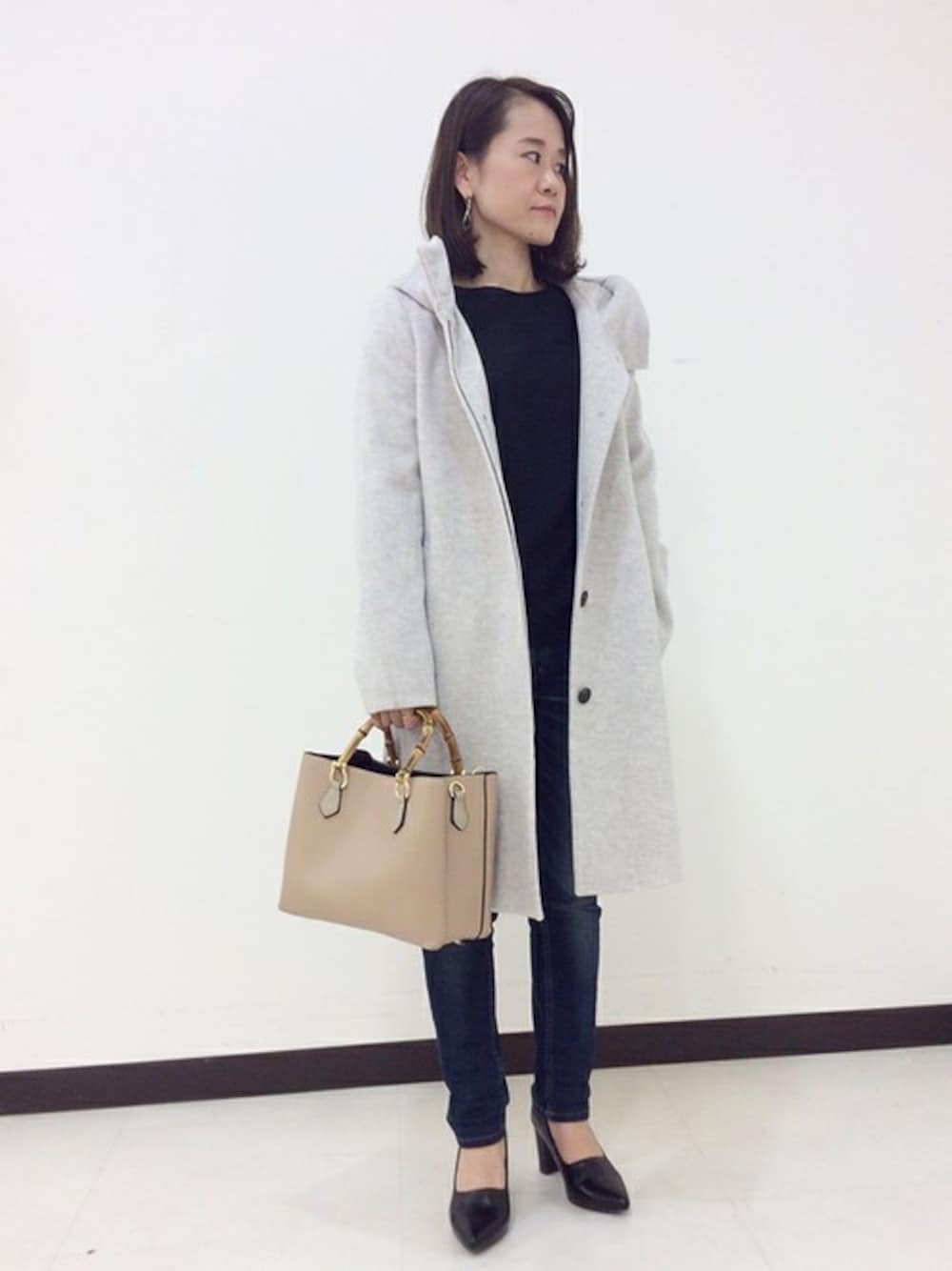 コート下に着やすいミドルゲージのニットにフード付きのコートを合わせたスタイリング。 ニットは袖がややドルマン調ですが、細く作ってあるのでインナーとして活躍出来るアイテム。 首あきも小さめでサイズも気になりません。 フード付きのスッキリしたコートは軽くて着やすく、大人っぽく着られる一枚です。 着用は1号のSサイズですが、大き過ぎず着れます。