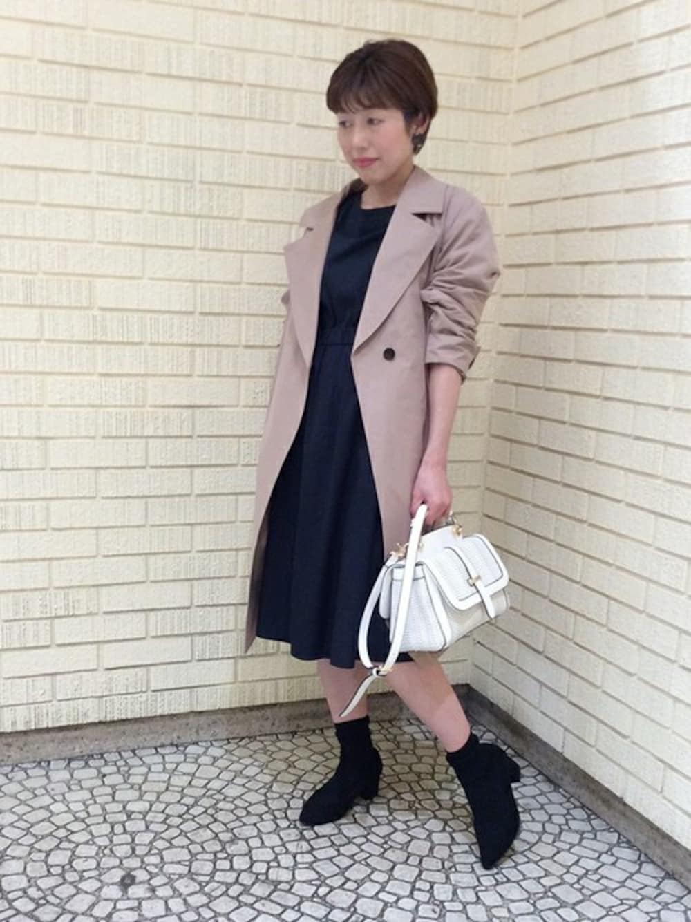 春コートにきれいめなワンピースを合わせたお出かけスタイル。 ワンピースは、身長155㎝の私が着て膝下の着丈でとても安心感があります。 ウエストのゴムがスタイルアップしてくれ、生地も柔らかくとても着心地◎