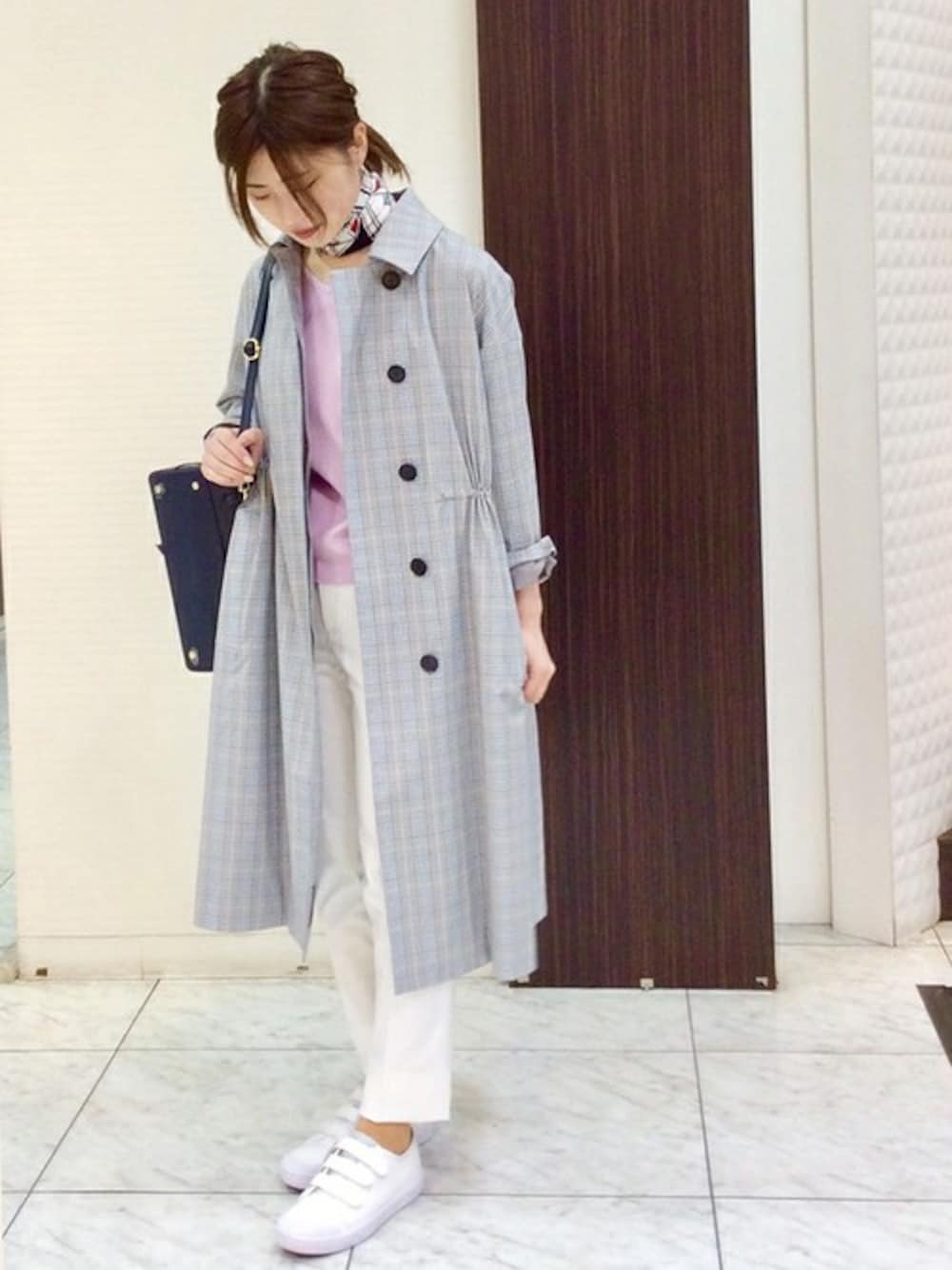 トレンドのステンカラーのコートを主役に、爽やかなスタイリングにしました。 インナーはコートと相性が良いライラックカラーと、白のボトムスでまとめてみました。 小物をアクセントに春のアクティブスタイルの完成です。