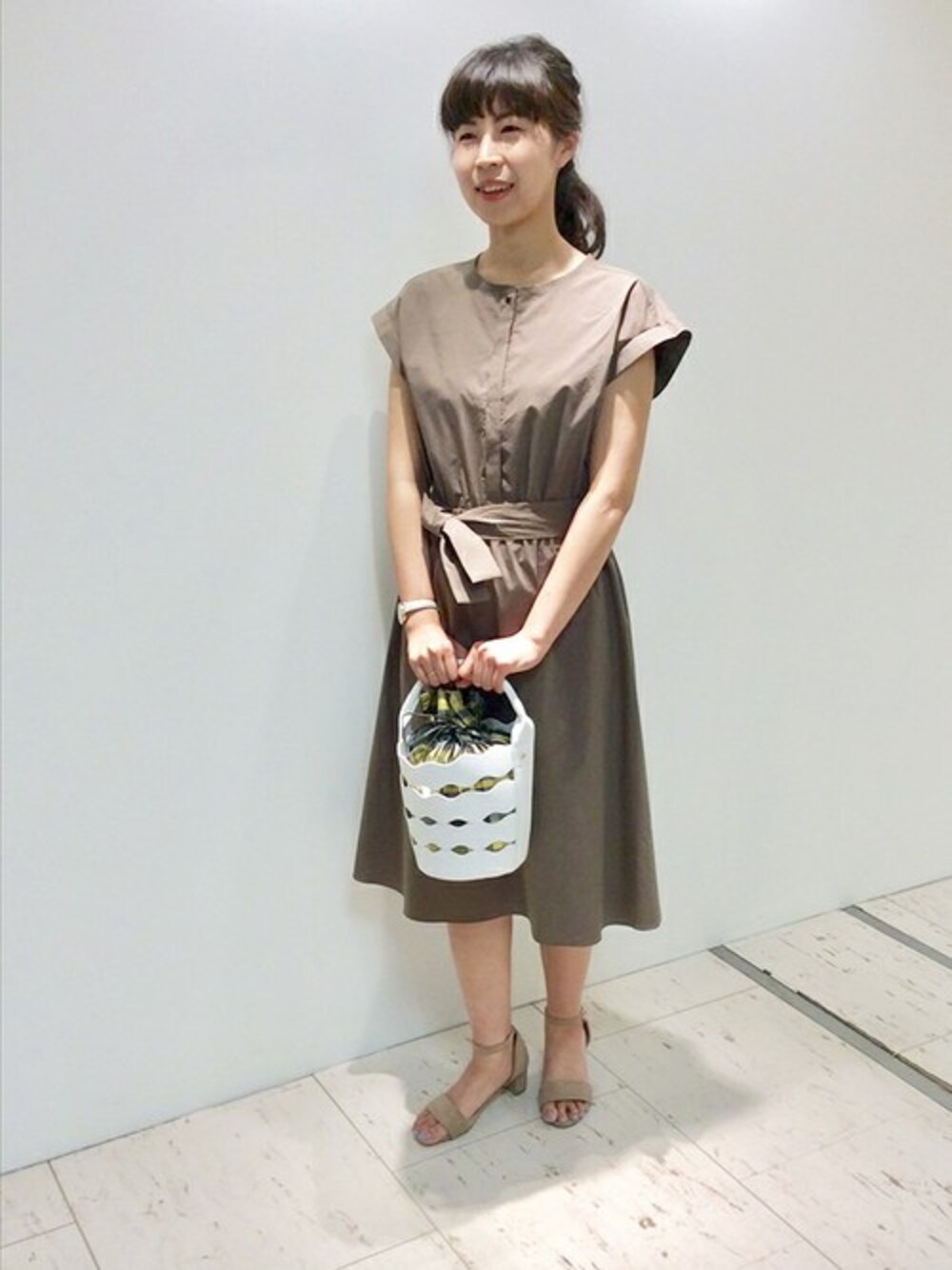 手洗い可能のワンピースは、暑い夏に涼しく着用出来る万能アイテム。 ウエストは程よいゴムでストレスなくお召しいただけます。 今年らしいブラウンカラーのウェッジサンダルで、夏のお出かけスタイルに仕上げました。