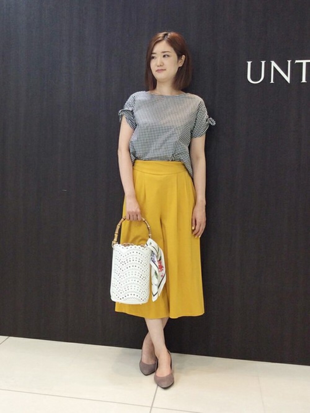 トレンドのギンガムチェックブラウスは、袖口のリボンがアクセントになり、二の腕をうまくカバーしてくれます。 イエローのガウチョパンツと合わせて、夏のキレイ目カジュアルスタイルにしました。