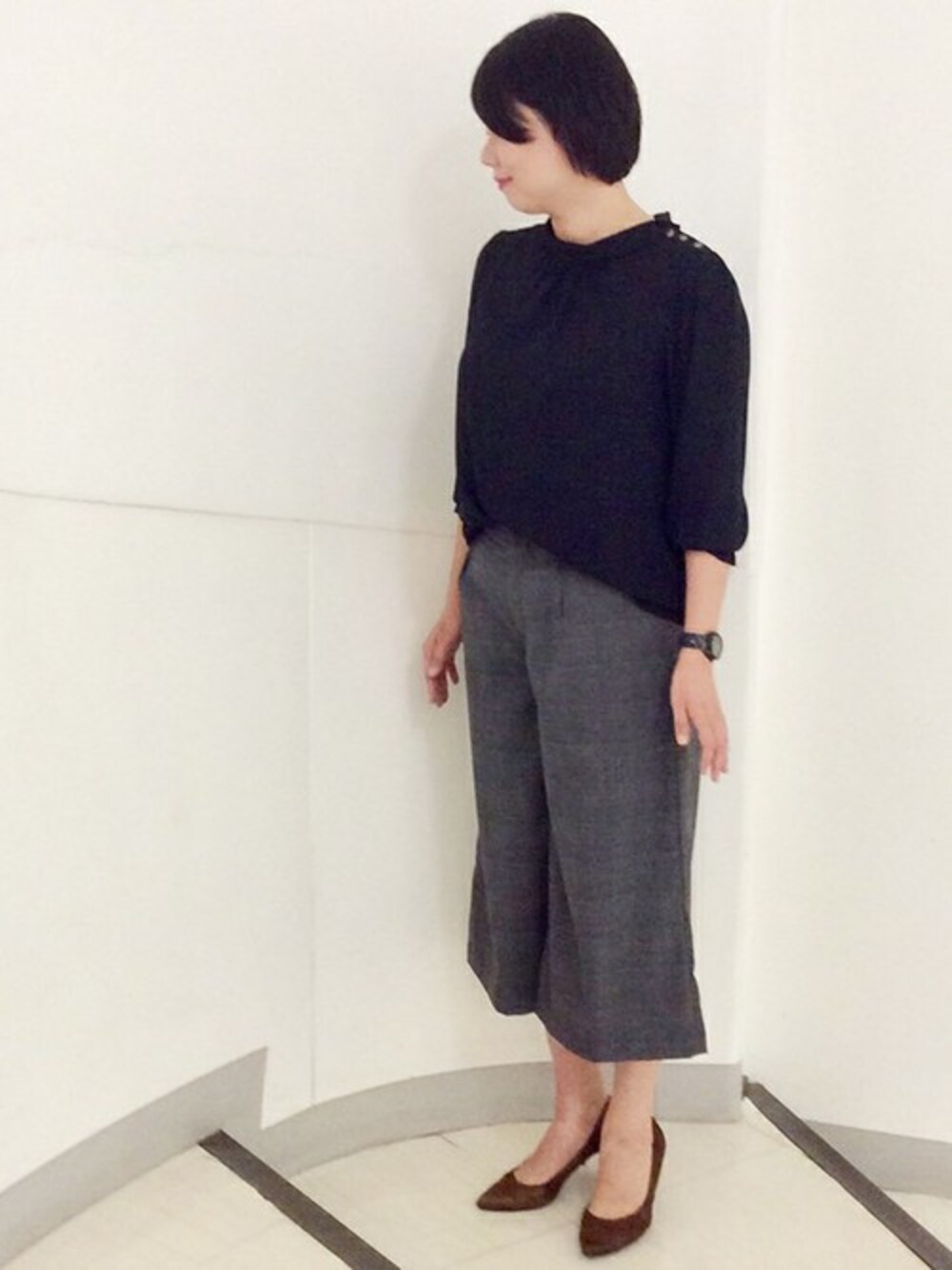 程よい高さのロールネックのデザインと袖口のゴムシャーリングで楽にお召しいただけるトップスに、流行りのチェックのパンツと合わせて甘すぎないスタイリングにしました。 どちらのお品もご自宅で手洗い可能なので、まだ汗ばむ今の時期からお召しいただけます。
