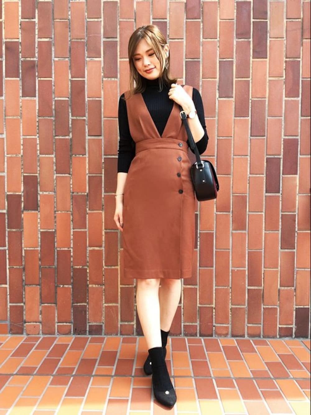 スッキリとしたシルエットのジャンパースカートはショルダー部分が取り外せて、巻きスカート風にも、2WAYでお使い頂けます。 トレンドの甘めなブラウンカラー×引き締め効果のある黒で女性らしいコーディネートに仕上げました。