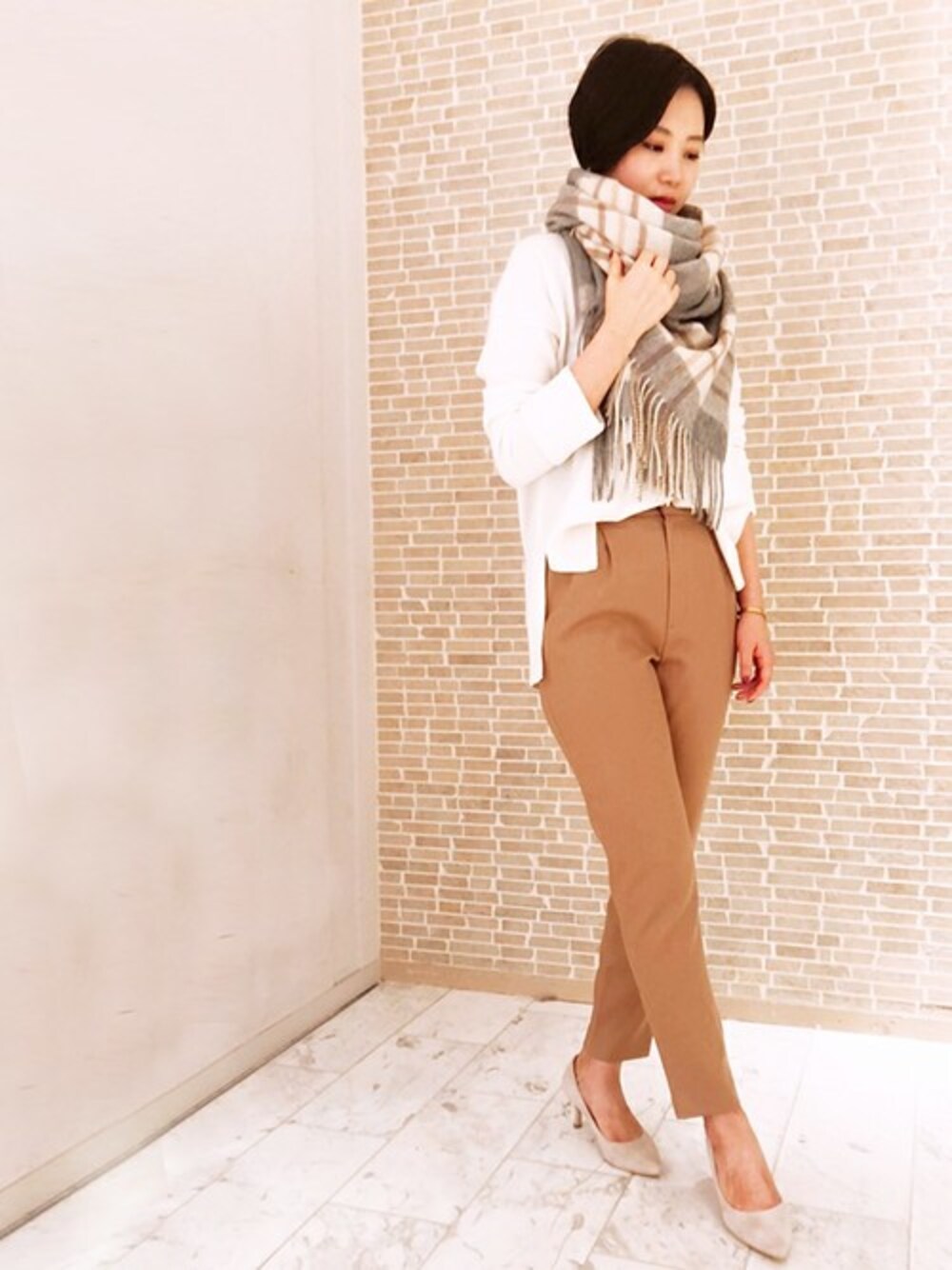 マニッシュなタックパンツにVネックニットのスタイリングを、ベージュトーンで統一し女性らしく仕上げました。 ストールで首元にボリュームを出し、さみしくなりがちなニット1枚着のコーディネートに華やかさをプラスしました。