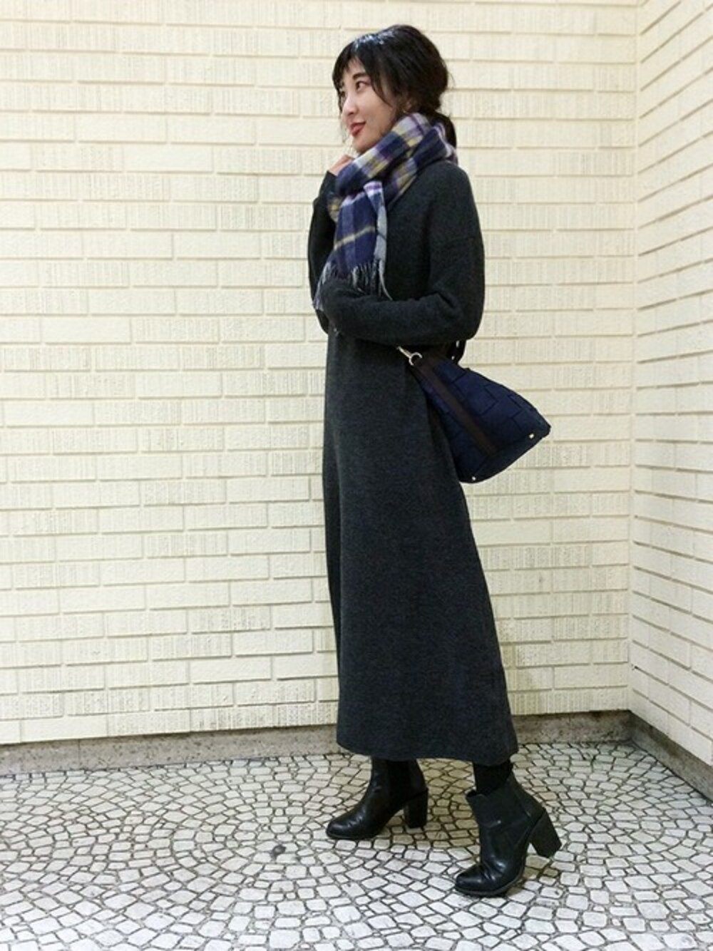 ロング丈のニットワンピースは軽くて暖かく、これからの時期にピッタリな1枚。 チェックの小物を合わせるとワンポイントになっておしゃれです。
