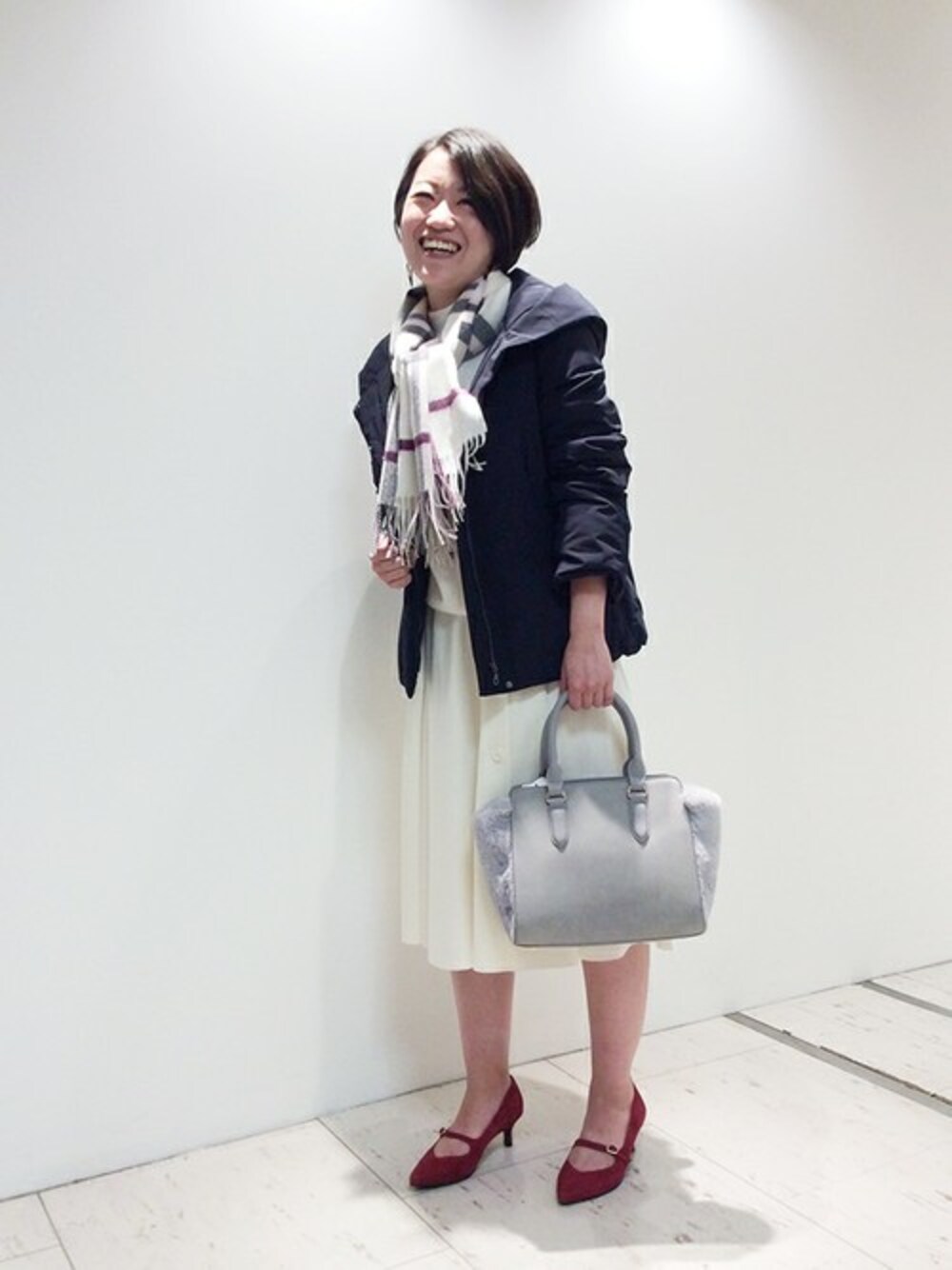 今からの季節にぴったりのストレッチショートダウンのご紹介です。 きれいめでありつつも、マットな光沢感があるのでOFFの時でも着用頂けます。 今回は白のスカートでキレイめにコーディネートしました。