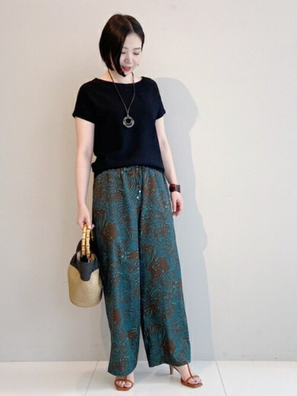 リラクシーなボタニカル柄のワイドパンツがメインのスタイルです! パンツの素材は、夏らしいドライな質感です。 ジャストウエストではくと、ローヒールのサンダルでも着用出来そうな丈感でした。 パンツに合わせて、アクセサリーやサンダルはブラウンにし、トップスやバッグにはブラックを取り入れて、カラーをリンクさせました。