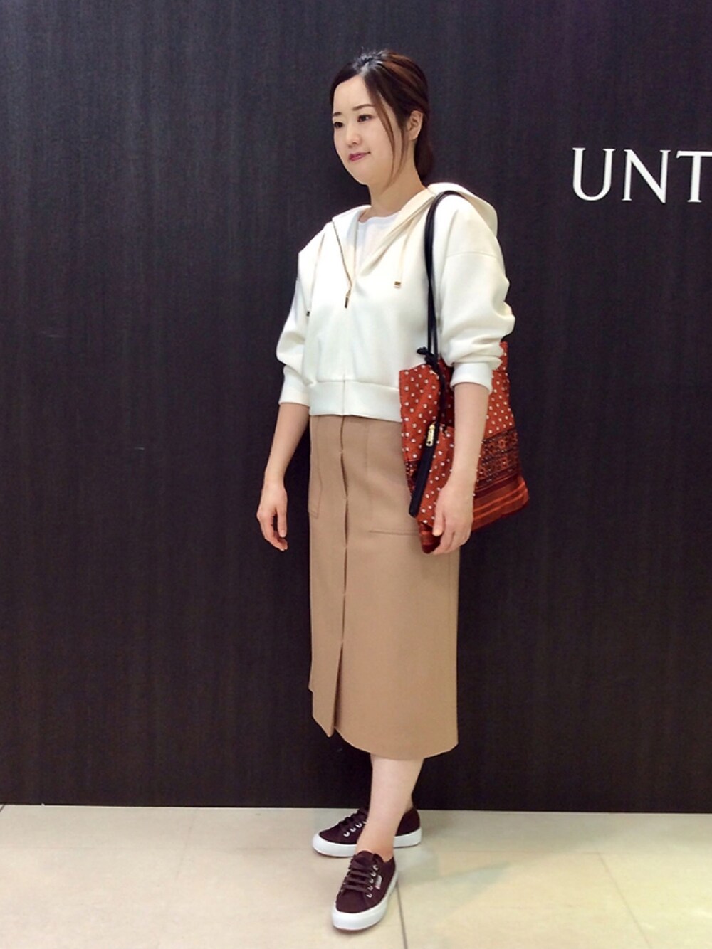 人気のパーカーを使ったスタイリングです。 適度なハリとボリューム感のあるお素材で、 ゆとりのある肩周りが、ラフな着心地です。 少しえりもとを抜いて着用しています。 セミタイトスカートと合わせて 大人カジュアルスタイルにしました。