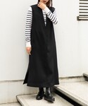 【モデル身長152cm】 ワンピースはさらっとした生地感で、身幅はゆったりとしていてとても着やすいです! 私はストライプのシャツを合わせてハンサムなコーデにしましたが、インナーを変えて様々な着こなしを楽しんでいただけます♪