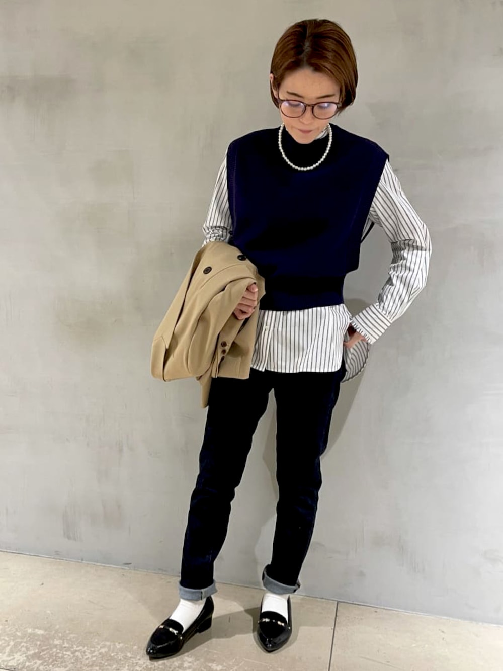 【モデル身長153cm】ニットベストは、コンパクトで首が詰まっているためシャープな印象に。シルク混の素材感で着心地がいいです。首元にフリルをあしらったブラウスとレイヤードしフェミニンさをプラスしたスタイリングに仕上げました。