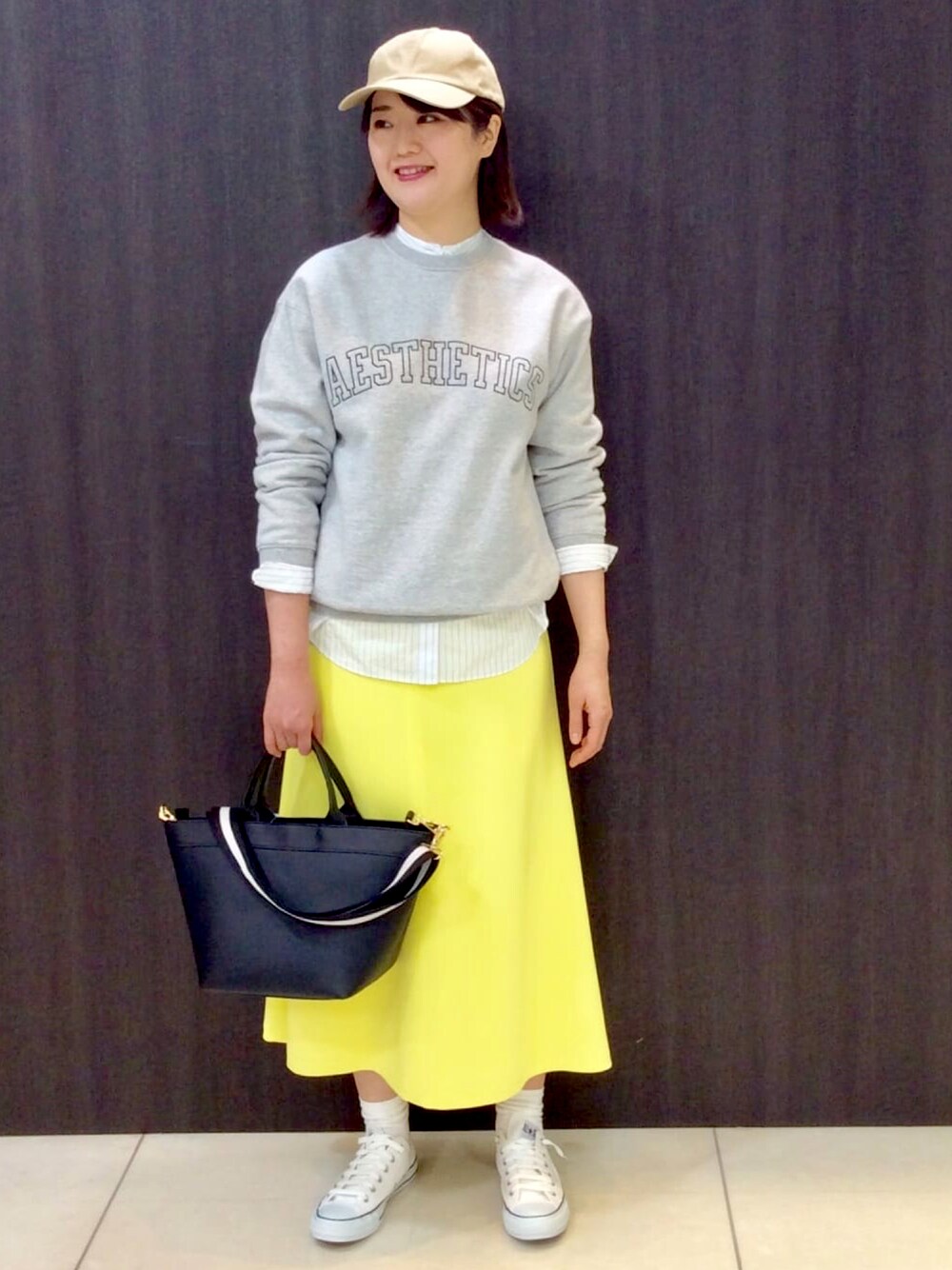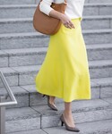 【モデル身長168cm】ロゴ入りトレーナーとスニーカーのカジュアルスタイルに、イエローのスカートで春らしく。 スカートは、落ち感のあるジョーゼット素材。後ろのサイドベンツスリットが、大人カジュアルに仕上げてくれます
