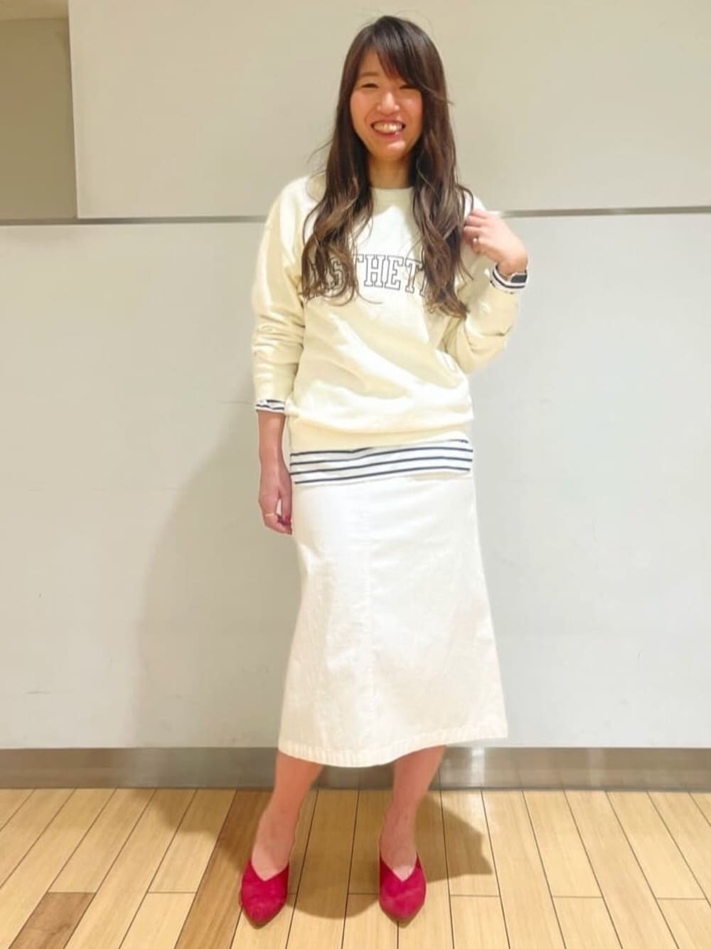 【モデル身長168cm】カジュアルになりがちなロゴプリントも、ホワイトのワントーンコーディネートにすることで女性らしい印象に。足元のカラーサンダルをポイントにしました。
