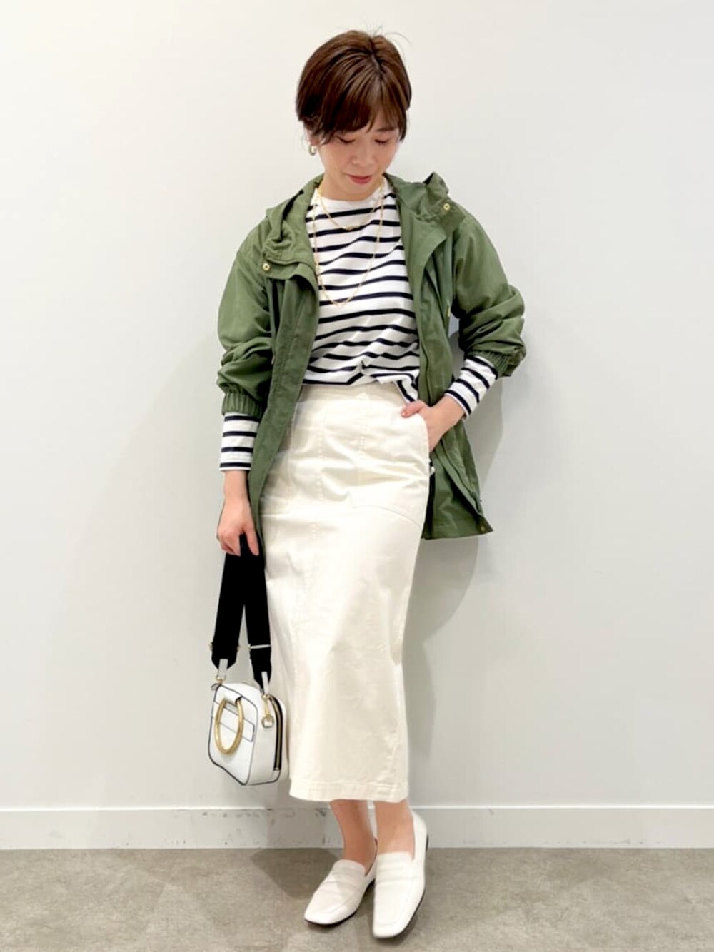 【モデル身長163cm】 優秀なボーダーカットソーは私の相棒です! しっかりめ生地のスカートで合わせて小物もホワイトで統一。スニーカーにせずローファーにしたのは崩しきっちゃうとカジュアルすぎるかも、、と思い、シャカシャカする生地のアウターでスポーティさをプラス!! 洗えますし、シワ気にならないし、ヒップ隠れる、、この春のイチオシアウターです♪