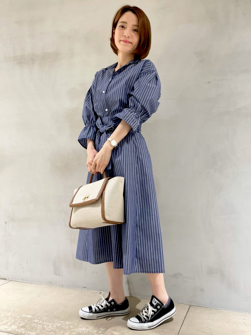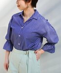 【モデル身長153cm】 ブラウスはゆったりとしたシルエットでボリュームのある袖が可愛らしい一枚です。コットン混で涼しげな印象になります!セットアップで合わせてキレイめなスタイリングにしました!