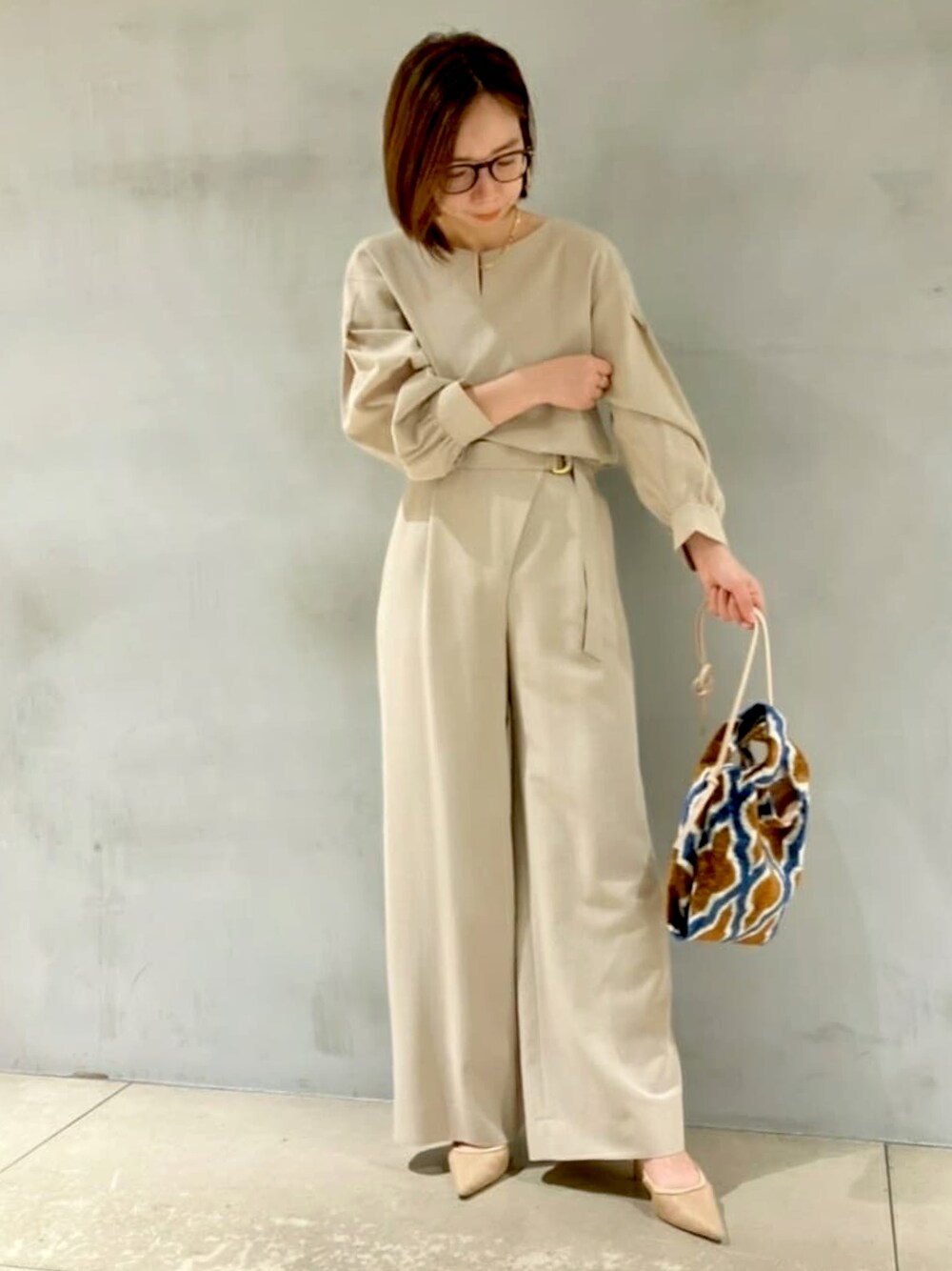 【モデル身長156cm】 こちらのセットアップはナチュラルな素材感なので、かっちりし過ぎずリラックスして着こなせます。 ブラウスはゆったりとしたシルエットで着心地がよく、パンツはハイウエストなので脚長効果があります!